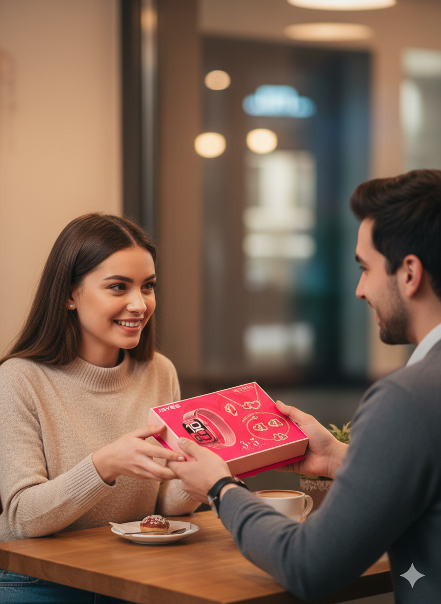 The smartwatch features a modern square display, smart notifications, and a sleek feminine design that fits both casual and formal looks. The included gold-tone jewelry set (necklace, bracelet, ring & earrings) adds a romantic touch π, perfect for daily wear or special occasions.