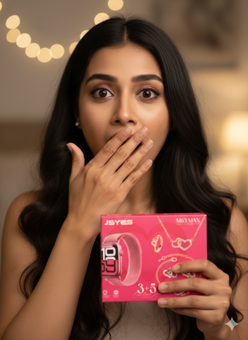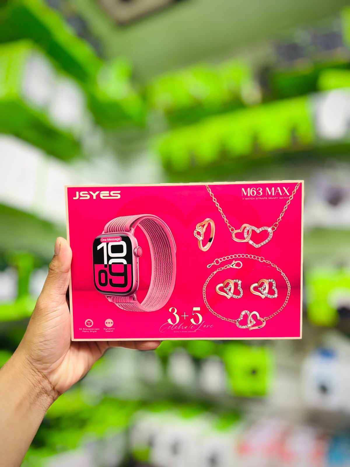Upgrade your style with thisΒ M 63 MAX Smartwatch & Jewelry Gift Set, a perfect blend of smart technology and elegant fashion πβ¨. As shown in the picture, this premium box includes a stylish M 63 MAX smartwatch, multiple interchangeable straps, and a beautiful heart-shaped jewelry setβmaking it an ideal gift for women and girls.